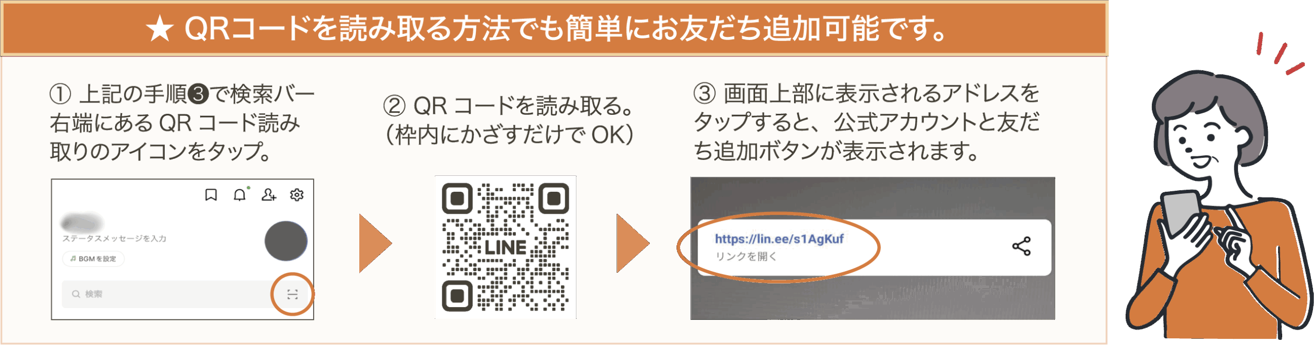 - ご利用には、まずはお持ちのスマートフォンに、下記の手順で「友だち追加」をお願いします。